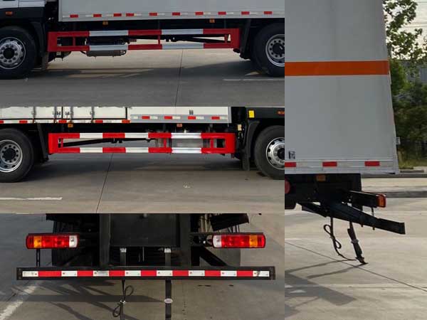 其它 | ABS型號(hào):ABS-E,ABS/ASR-24V-4S/4M,CM4XL-4S/4M,3550D-1010;ABS生產(chǎn)企業(yè):威伯科汽車控制系統(tǒng)(中國)有限公司,東科克諾爾商用車制動(dòng)系統(tǒng)(十堰)有限公司,廣州瑞立科密汽車電子股份有限公司,東科克諾爾商用車制動(dòng)系統(tǒng)(十堰)有限公司;安裝有限速裝置;限速裝置限速(km/h):80;安裝有具有衛(wèi)星定位功能的行駛記錄儀;選裝描述:選裝側(cè)門型式及位置,選裝側(cè)門數(shù)量,選裝不開側(cè)門,廂體側(cè)面板選裝開百葉窗,選裝瓦楞板結(jié)構(gòu).該車型可選裝ETC車載裝置;發(fā)動(dòng)機(jī)/油耗值(L/100km)對(duì)應(yīng)關(guān)系為:F4.5NS6B220/24.4,B6.2NS6B210/26;側(cè)后防護(hù)情況:側(cè)、后防護(hù)材料均為Q235,螺栓連接,后防護(hù)截面尺寸120×70mm,下邊緣離地高450mm;車廂頂部封閉且不可開啟;運(yùn)輸獨(dú)立容器(瓶)包裝的貨物;危險(xiǎn)貨物類項(xiàng)號(hào):第3類;其他說明:僅選用排氣管前置、前輪盤式制動(dòng)及子午線輪胎的底盤.該車轉(zhuǎn)向輪安裝輪胎爆胎應(yīng)急防護(hù)裝置,后軸采用空氣懸架.該車為危險(xiǎn)貨物運(yùn)輸車。選裝后尾板時(shí),后防護(hù)材料為Q235,焊接,截面尺寸120×50mm,下邊緣離地高450mm。尾板收起狀態(tài)水平長(zhǎng)度為290mm,尾板質(zhì)量為550kg。隨底盤選裝駕駛室;選裝燃油箱,電瓶,尿素罐,后處理,儲(chǔ)氣筒左右安裝位置。 | ||