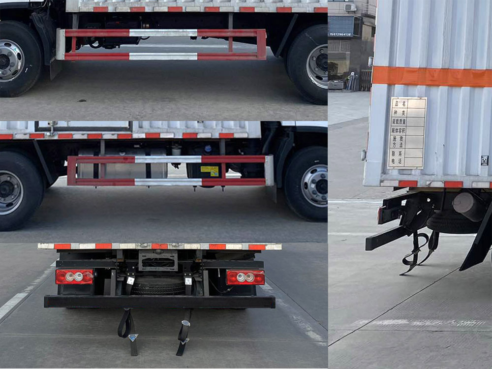 | 其它: | 1、該車適用于運輸危險品。廂體頂部封閉不可開啟。運輸具有獨立容器(瓶)包裝的物品,運送危險物品類項號:8。2、側(cè),后防護(hù)材料均為Q235,螺栓連接;后防護(hù)截面尺寸100×50mm,下邊緣離地高410mm。廂體側(cè)面選裝開門型式及位置,選裝不帶側(cè)開門,選裝瓦楞板結(jié)構(gòu);選裝百葉窗。3、隨底盤選裝排半駕駛室,選裝導(dǎo)流罩。僅選用排氣管前置、限速裝置(限速80km/h)、前輪盤式制動及子午線輪胎的底盤;轉(zhuǎn)向輪裝備輪胎爆胎應(yīng)急防護(hù)裝置。安裝帶衛(wèi)星定位功能的行駛記錄儀。ABS系統(tǒng)型號:ABS-VI.E;生產(chǎn)企業(yè):廣州瑞立科密汽車電子股份有限公司.ABS系統(tǒng)型號:ABS-E;生產(chǎn)企業(yè):威伯科汽車控制系統(tǒng)(中國)有限公司.ABS系統(tǒng)型號:ABS8.8 ECU 24V,生產(chǎn)企業(yè):東科克諾爾商用車制動系統(tǒng)(十堰)有限公司。發(fā)動機(jī)/油耗值(L/100km)對應(yīng)關(guān)系為:CY4SK261/16.09,D30TCIF1/16.19,F2.8NS6B156/15.39,F3.8NS6B156/14.90??蛇x裝ETC車載裝置。 | ||