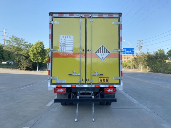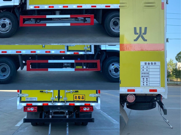 嚴(yán)格按照公告尺寸制作。外板采用優(yōu)質(zhì)冷軋鋼板帶百葉窗,內(nèi)飾為導(dǎo)電性能良好的鋁平板有透氣孔,矩形骨架結(jié)構(gòu)內(nèi)部填充防潮阻燃擠朔板,復(fù)合加鉚合工藝。廂體四周鋁合金包邊及包角,車廂底板鋪設(shè)防靜電膠皮,廂體前臉50公分高鋪設(shè)防靜電膠皮。后部設(shè)置對開門,可選裝側(cè)門位置,廂體內(nèi)部兩側(cè)安裝捆綁貨物的臥環(huán)。廂體內(nèi)部安裝氣體感應(yīng)器及防盜報警器。車廂一周粘貼橙色放光帶,箱體粘貼 菱形告示牌,安全告示牌,危險品牌,箱體安裝示廓燈(前白后紅),拖地靜電帶。箱體可選裝瓦楞板工藝。